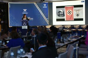 Een van de sprekers bepleitte een Europees verbod op de verkoop en tentoonstelling van nazisymbolen. Hakenkruizen, nazivlaggen, helmen van soldaten, de jurk van Eva Braun… Maar wat is er mis met de handel in dit soort prullaria? Misschien juist zichtbaar maken en onderdeel laten zijn van de strijd tegen het antisemitisme?