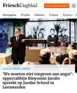 Het klaslokaal van de Joodse School Leeuwarden was tot aan de nok toe gevuld. In Leeuwarden woonachtige Israëliërs, leden van de Joodse Gemeente Friesland en Vrienden van Israël kwamen bijeen om… Ja, waarom eigenlijk? In de aankondiging stond vermeld dat de bijeenkomst, last minute georganiseerd, zou gaan over “hoe gaan we hier in Nederland om met de moeizame situatie in Israël, waarmee verschilt deze Chanoeka van alle andere Chanoeka-jaren en wat is de diepere betekenis van het Chanoeka-licht”. Het werd een erg fijne en zinvolle bijeenkomst. Ik heb uiteraard wel onvoorbereid gesproken, maar de Friese namiddag was eigenlijk meer een gesprek met, dan een lezing voor! Uiteindelijk werd er door de groep-niet-joodse-aanwezigen besloten om de Joodse Gemeente dusdanig te beschermen dat ze geen enkele angst voor geweld hoeven te hebben als ze voor de deur van de Joodse School bij het monument de Menora gaan ontsteken.