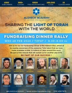 The Alshech Academy is a Torah-Learning Community based in the Ancient Alshech Synagogue in the Holy City of Tzfat. The Academy offers a diverse schedule of English-Language Torah Classes from world-class Rabbis and Teachers, sharing the Wisdom of Our Sages with students around the world. The Alshech organises a fundraising diner. They will broadcast the dinner live so everyone can hear all the speeches. Perhaps this is also interesting for our community and in Antwerp or Brussels.