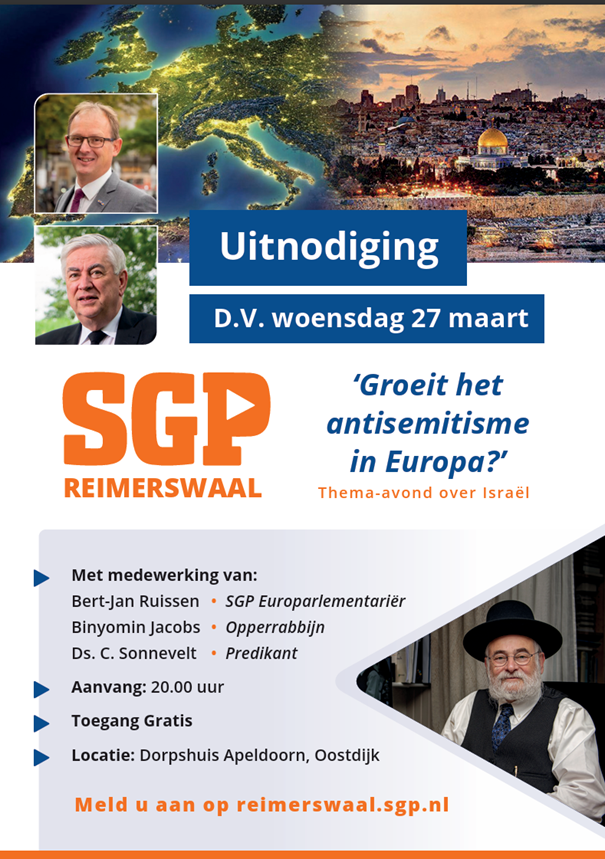 Maar wel moet ik volgens mijn vriend de journalist blijven waarschuwen en vooral niet doen alsof er niets aan de hand is! En dus gaan we dadelijk de koffers wel pakken, maar voorlopig uitsluitend om naar Amersfoort te reizen, want maandagmiddag moet ik bij Family7 zijn voor een tv opname over de discussie in Israël over wel/niet orthodoxe Joden in het leger. En mocht u woensdagavond in Zeeland zijn, dan zie ik u graag in Oostdijk bij een bijeenkomst van de SGP waar ik mag spreken over: Hebben Joden recht op Israël?