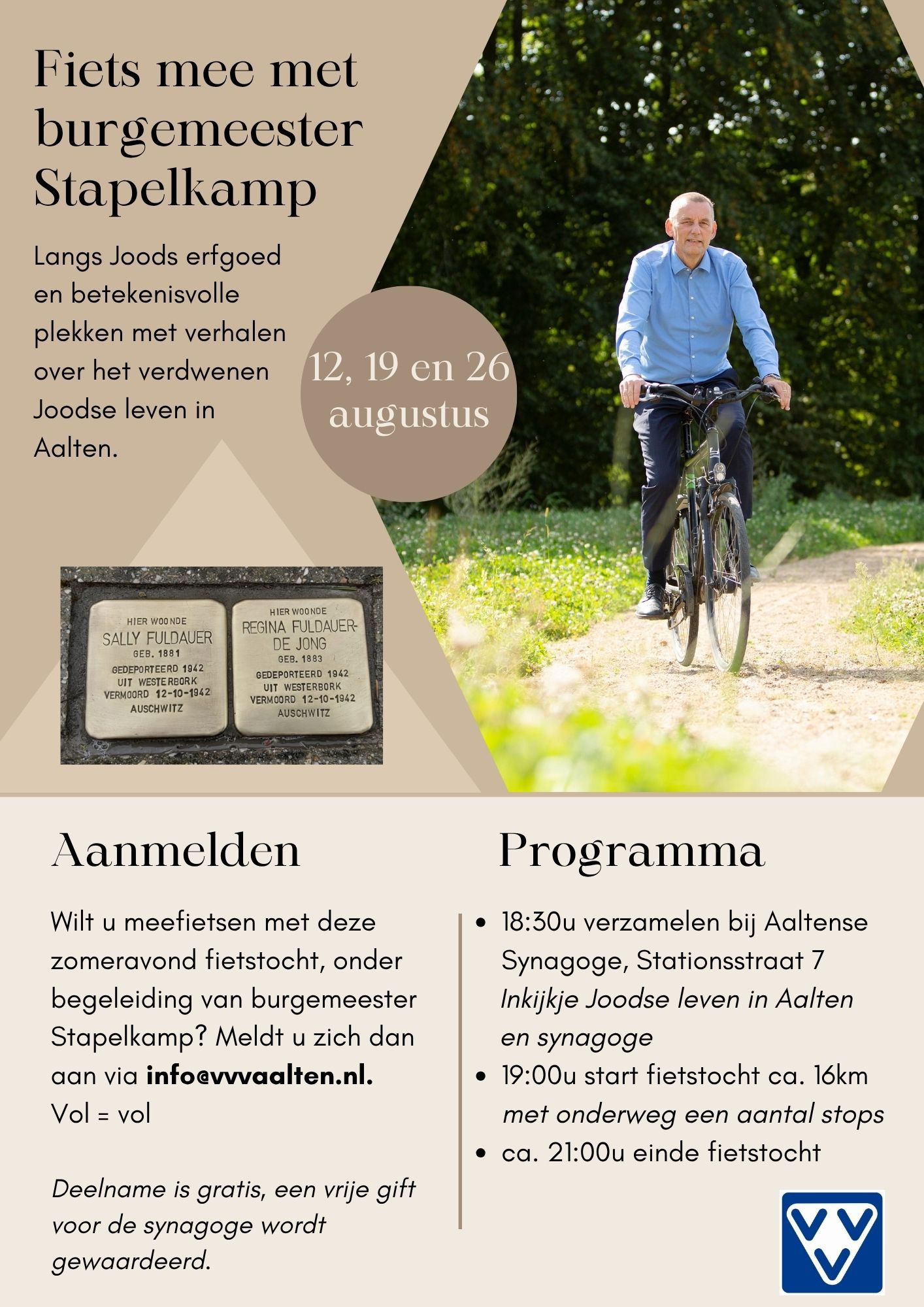 Deze zomervakantie kunt u samen met burgemeester Anton Stapelkamp een bijzondere fietstocht maken langs Joods erfgoed in Aalten. Op dinsdagavond 12, 19 en 26 augustus leidt hij inwoners en toeristen langs betekenisvolle plekken uit de route.